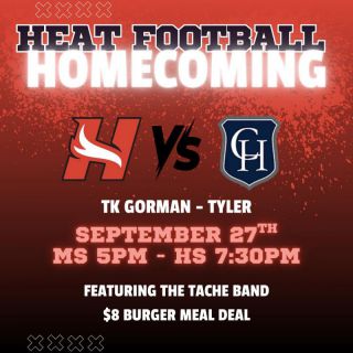 Add to Your Calendar: 09/27/2025 19:30 09/27/2025 20:30 America/Chicago HEAT Homecoming Football Game w/ TACHE Band